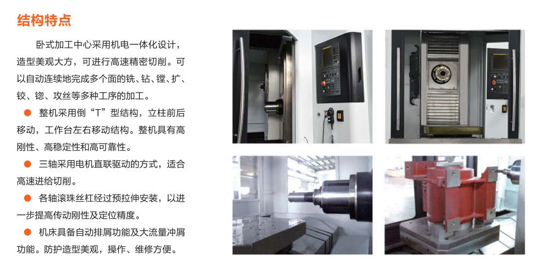 臥式加工中心采用機(jī)電一體化設(shè)計(jì),造型美觀大方,可進(jìn)行高速精密切削??梢宰詣舆B續(xù)地完成多個(gè)面的銑、鉆、鏜、擴(kuò)、鉸、锪、攻絲等多種工序的加工。